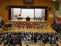 音楽室の吹奏楽部が校歌を演奏し、各教室で歌いました。