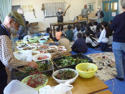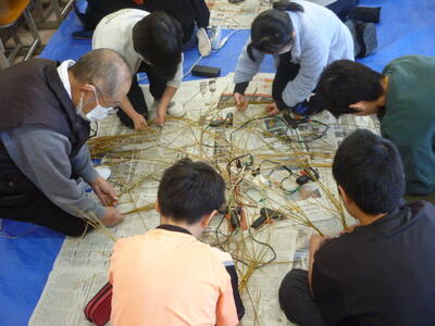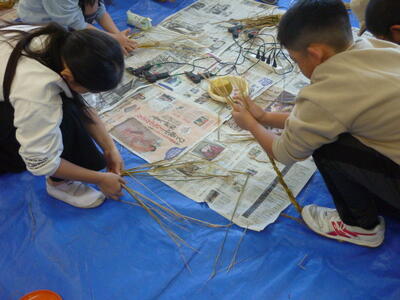 年間を通して5年生の稲づくりにご指導をいただきましたボランティアの方々に、稲わらをつかったリースづくりを教わりました。余すところなく活用する姿勢に、作物を育てることの意義を感じます。