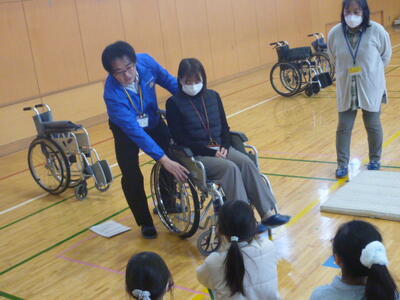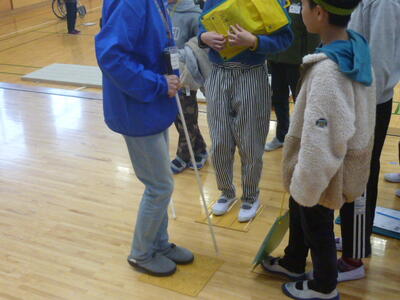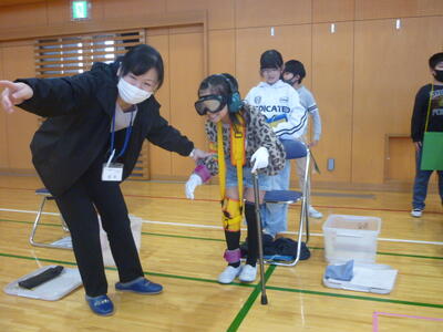 市川市社会福祉協議会の皆様、民生委員の皆様、高齢者サポートセンターの皆様にお越しいただき、視覚的な障害体験・身体的な障害体験、高齢者の対場に立った体験をして、障害をお持ちの方や高齢者の方の立場と介助に携わる人の立場の両方を学習しました。