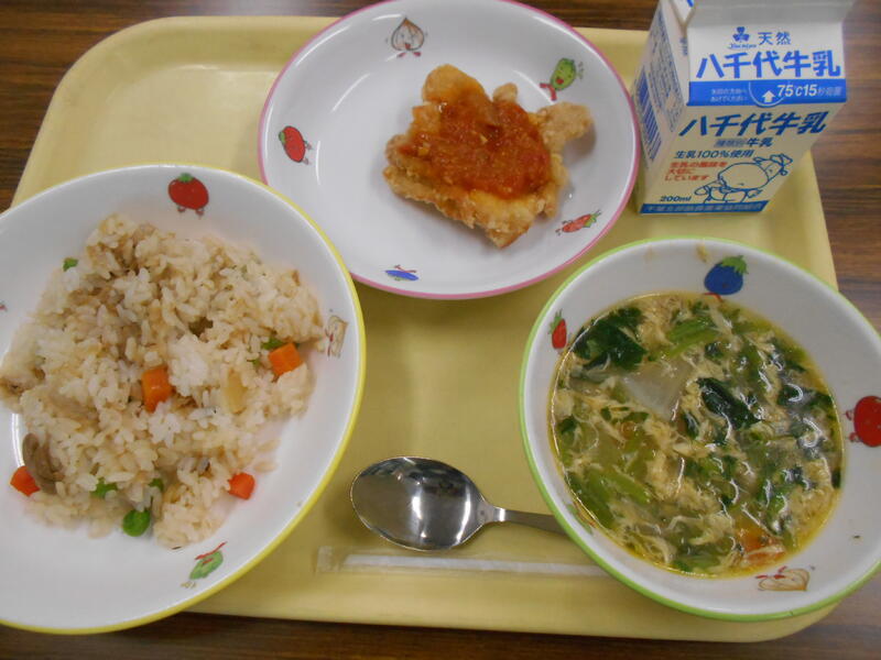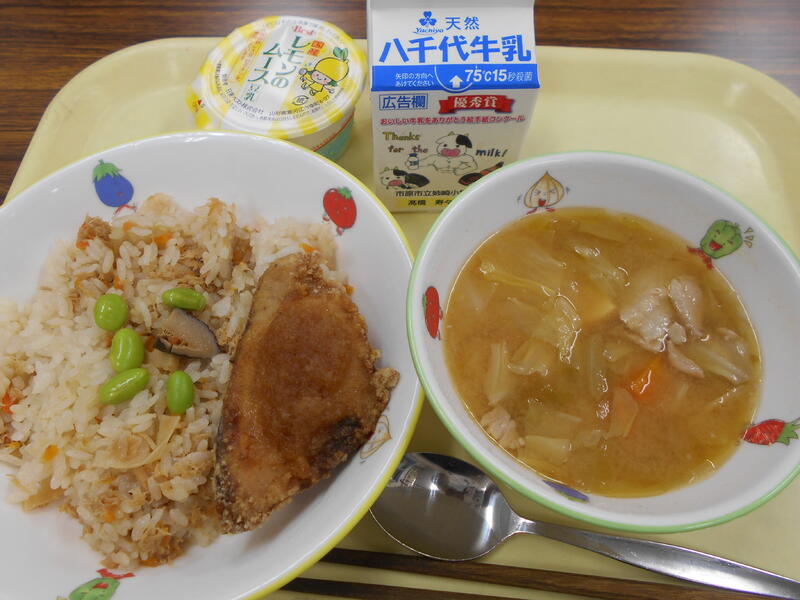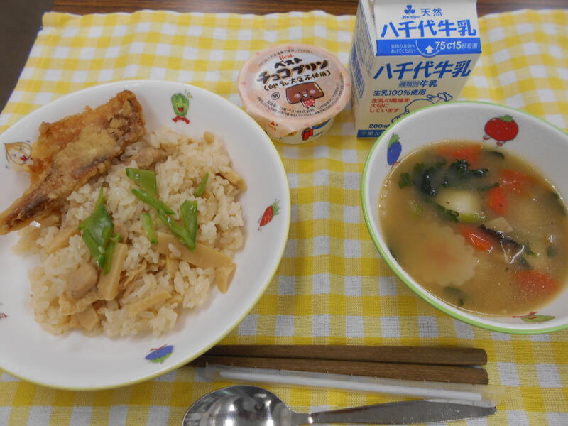 たけのこごはん 赤魚のから揚げ 白玉汁 豆乳チョコプリン 牛乳