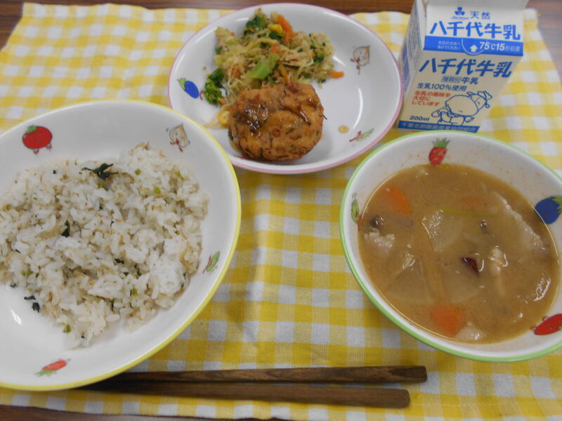 小松菜としらすの混ぜご飯 飛龍頭あんかけ キャベツのおかか和え さつまいも汁 牛乳