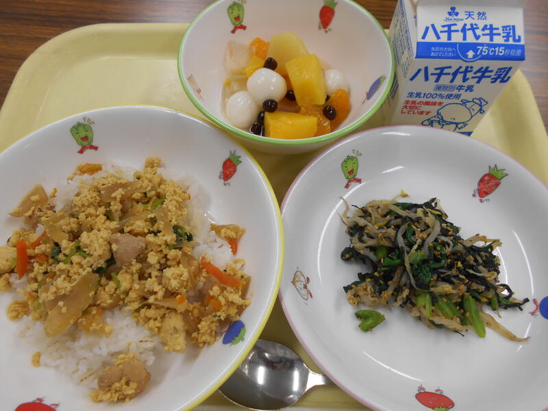 ひじきご飯 豆腐ナゲット 五色和え じゃがいもと玉ねぎの味噌汁 ジョア(プレーン)
