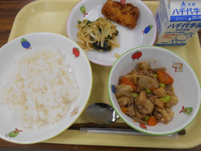ごはん いかのかりん揚げ ピリ辛ごまみそ和え 豚肉と里芋の煮つけ 牛乳
