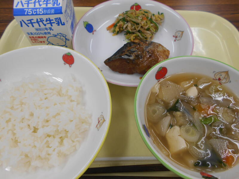 今日は、和風のメニューです。さばは塩こうじにつけて焼きました。塩こうじとは、米のこうじに塩と水を混ぜて発酵させた日本の伝統的な調味料です。発酵食品なので、ビタミンや乳酸菌を多く含み、おなかの調子を整えたり、お肌つるつる老化防止に役立ったりします。肉や魚を塩こうじに漬け込むと、うまみが増します。魚料理のメニューは、給食の残りが多くなりがちですが、白いご飯にあうおかずと組み合わせて、魚も野菜もおいしき味わってほしいです。