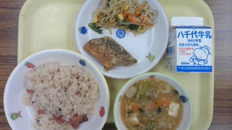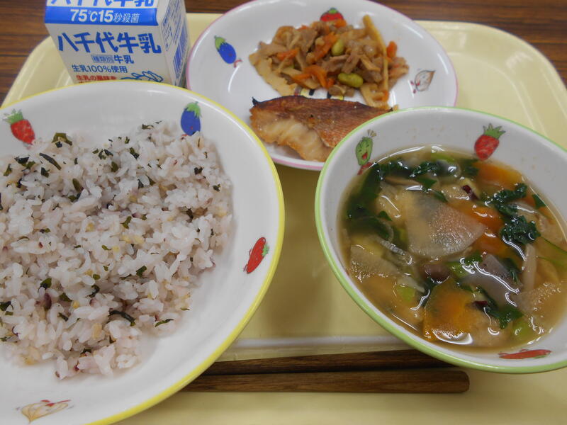 五穀わかめごはん 赤魚の香味焼き たけのこきんぴら さつまいもと青菜ののっぺい汁 牛乳