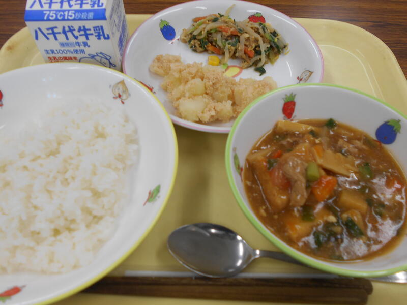 今日は、かみかみメニューとカルシウムがたくさんとれる献立です。カルシウムは、強い骨や歯を作り、カルシウムが足りないとイライラしたり、集中力がなくなったりします。今日の食材でカルシウムが多いのは、牛乳、ししゃも、小松菜、しらす、生揚げです。特にししゃもは丸ごと食べられるので強い骨を作ることができます。