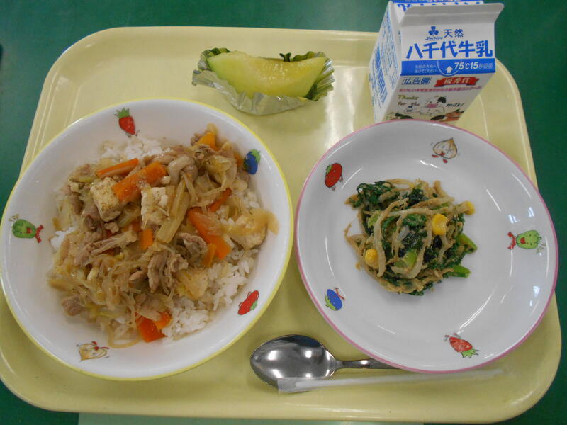 豚肉と焼き豆腐のすき焼き丼 (麦ごはん) 小松菜のごま酢あえ メロン 牛乳