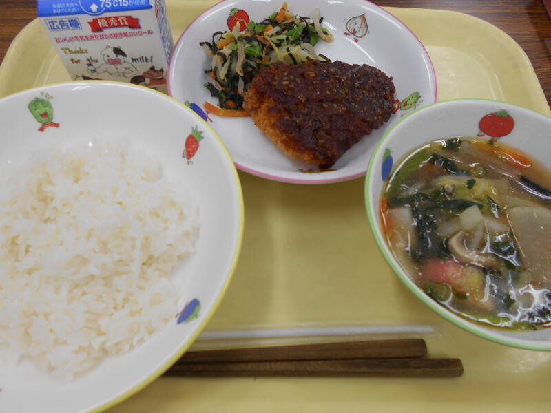 今日は、野菜をたっぷり使った和風献立です。給食では、毎日、野菜を使います。野菜は使う量だけではなく、小松菜やニンジンなどの「色の濃い野菜」とダイコンやタマネギなどの「色の薄い野菜」をバランスよく取り入れています。ニュースなどでも話題になっていますが、天候不順などの影響で野菜の値段が上がっています。残されてしまうことが多い野菜料理ですが、「体の調子を整える」ビタミンや食物繊維がたっぷり入っています。