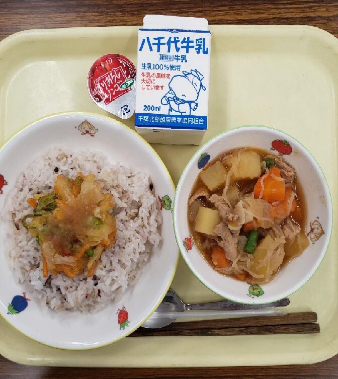 給食では、夏野菜が多く入った丸い「かき揚げ」を五穀ごはんにのせて生姜入りの大根おろしのソースをかけて食べます。手作りのかき揚げを作るのはとても大変ですが、北方小学校の皆さんが今年残り半年を元気に過ごせるようにと一生懸命作りました。