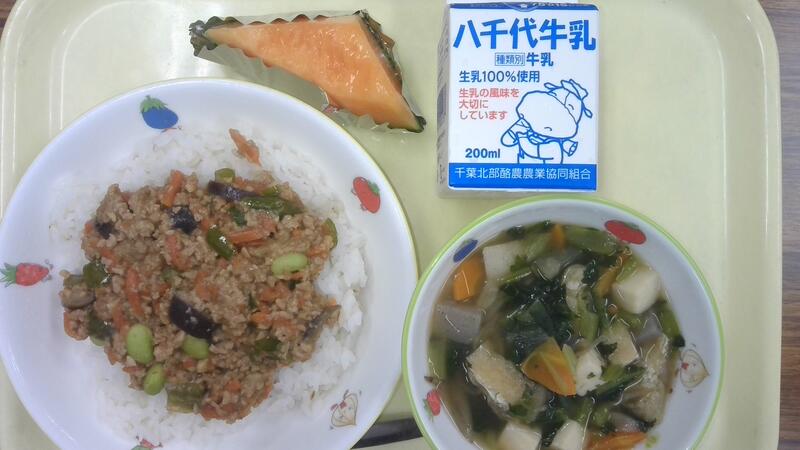 今日は、なす入り肉みそ丼です。茄子のきれいな紫色には病気を予防したり、血液をサラサラにするパワーが含まれているため、皮ごとたべると良いです。なすを苦手yに思う人が多くいますが、甘い肉みそと野菜がごはんにく合います。旬の食材として、ピーマンと枝豆も入っています。