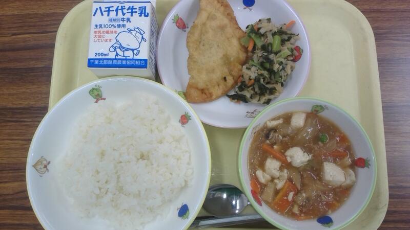 ごはん 五目豆腐 ツナと切り干し大根のサラダ カボチャの包み揚げ 牛乳