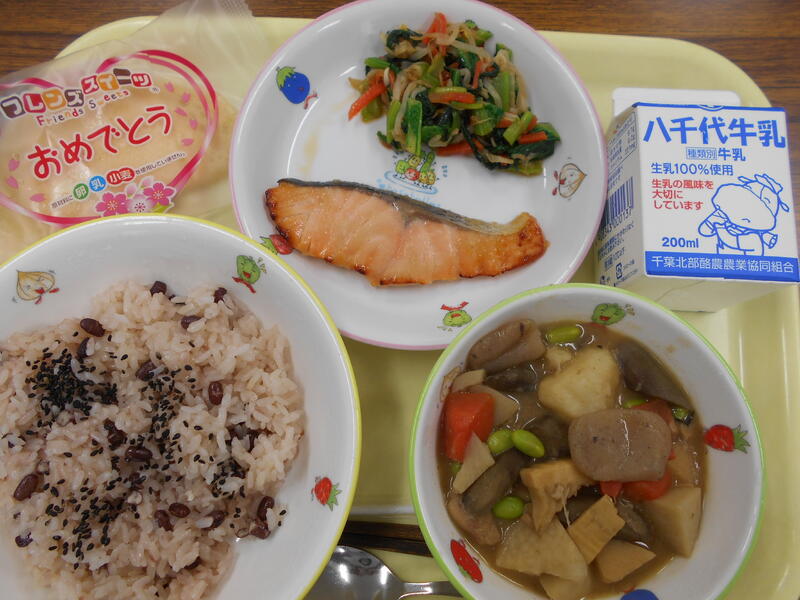 お赤飯 鮭の西京焼き もやしと小松菜のピリ辛和え いりどり煮 米粉のお祝いクレープ(いちご) 牛乳