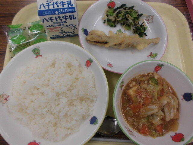 今日は、かみかみメニューとカルシウムがたくさんとれる献立です。カルシウムは、強い骨や歯を作り、カルシウムが足りないとイライラしたり、集中力がなくなったりします。今日の食材でカルシウムが多いのは、牛乳、ししゃも、小松菜、しらす、生揚げです。特にししゃもは丸ごと食べられるので強い骨を作ることができます。