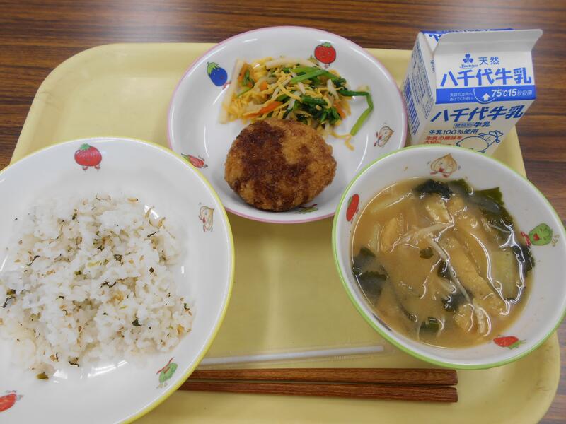 じゃこいり菜めし 春キャベツのメンチカツ 友禅和え じゃがいもの味噌汁 牛乳