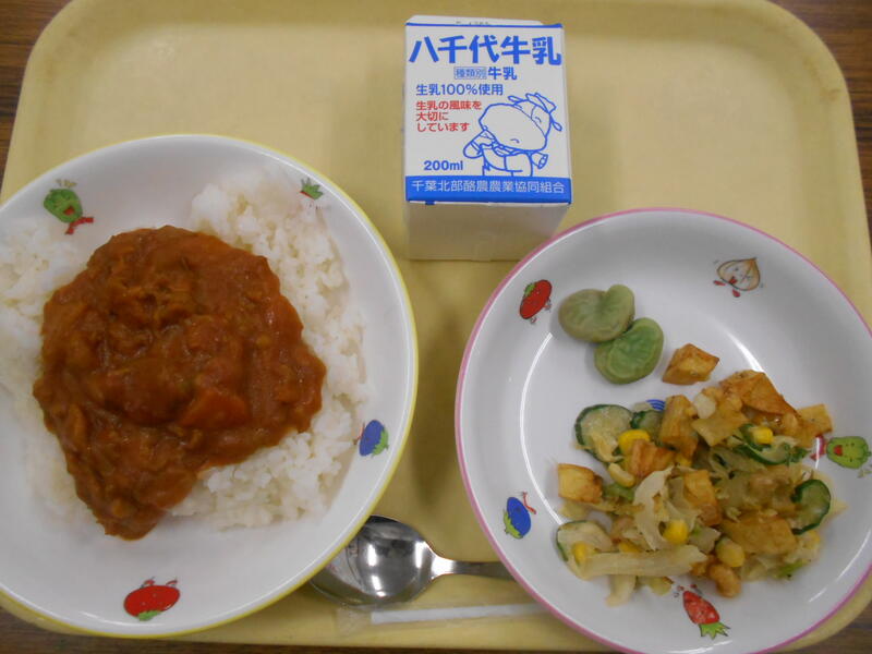 ごはん ハッシュドポーク じゃがいもと大豆のカミカミサラダ 一年生のそらまめ 牛乳