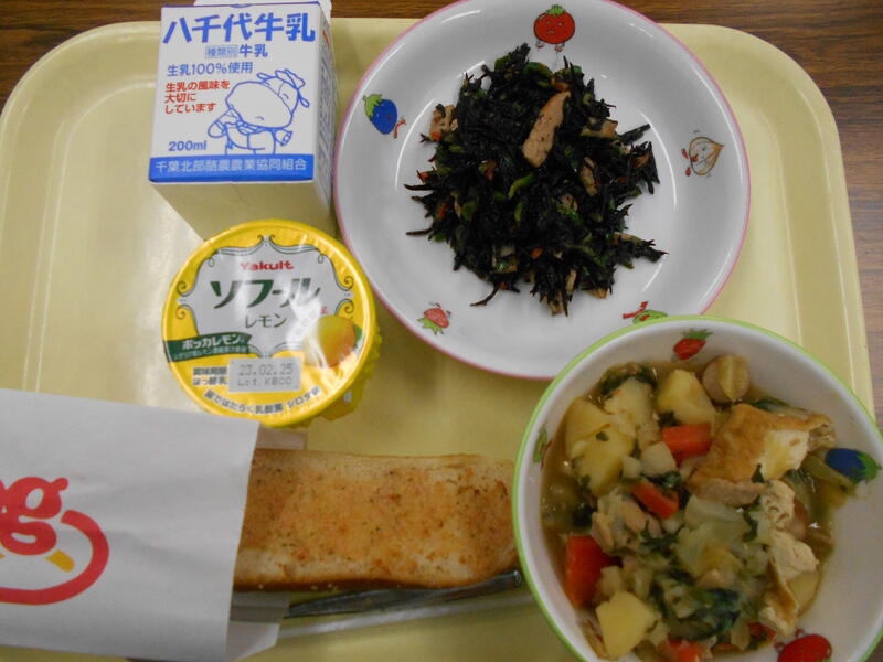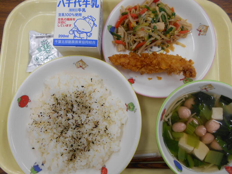 今日は、ゆかりごはんを提供する予定でしたが、「白ごはん」と「いそわかめふりかけ」に変更となりました。