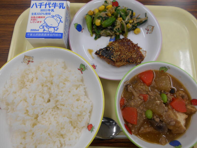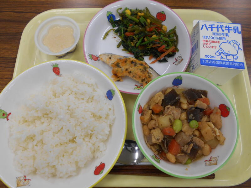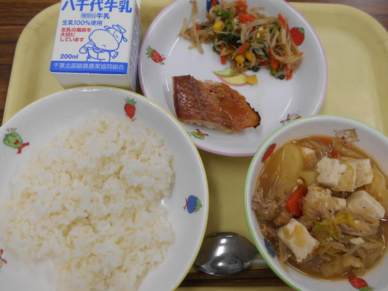 煮物の「肉豆腐」には、「焼き豆腐」を使いました。「焼き豆腐」は水切りした木綿豆腐の両面を直火で軽く焼いてあぶり、焼き目をつけたものです。成長期のみなさんに大切なたんぱく質を多く含みます。いろいろな食材をとれるように今日は20種類の食材を使って給食を作っています。