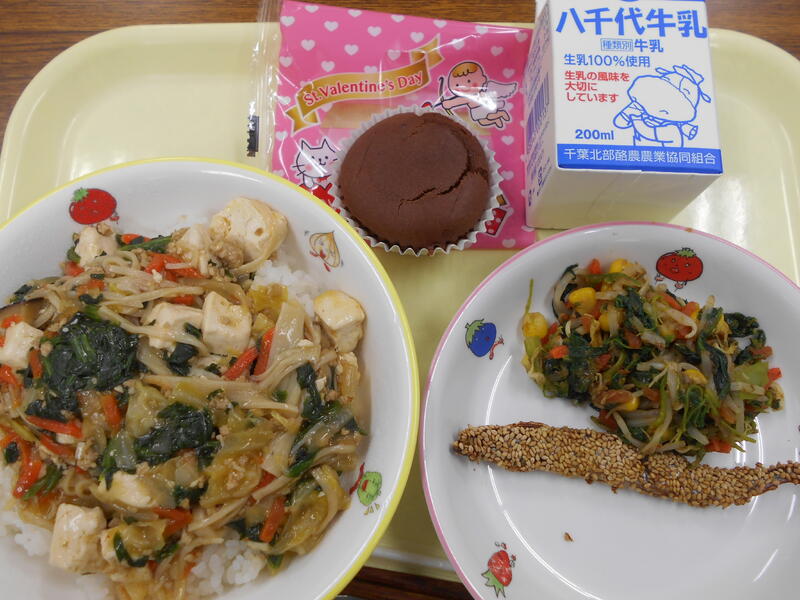 デザートは「バレンタインデー」にちなんで、米粉で作ったチョコレートケーキです。中にチョコレートソースが入ってる特別バージョンです。