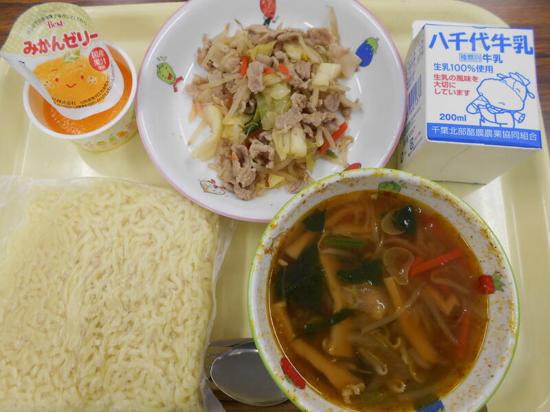 醤油ラーメン 肉たっぷり野菜炒め みかんゼリー 牛乳