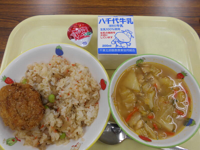 ごぼうピラフ かぼちゃチーズコロッケ ジャガイモ入りコンソメスープ 一口りんごゼリー 牛乳