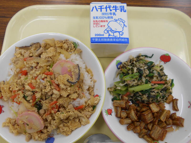 主菜の「木の葉どん」は、関西地方でよく食べられている練り物を使い甘辛く味付けして卵でとじたものです。給食では、かまぼこを使いました。