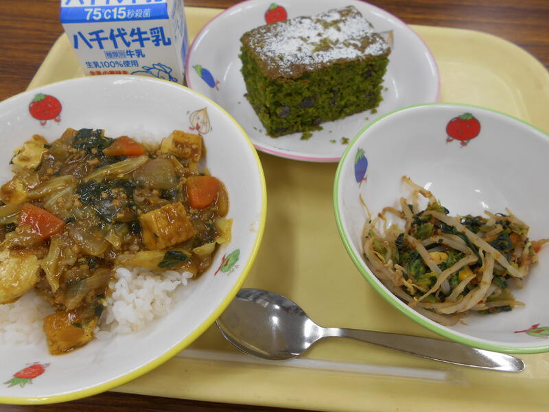 今日は「和風カレー丼」です。かつおぶしのだしにカレールウと醤油で和風の味付けにしました。多くの野菜と生揚げが入っているので、一皿で栄養バランスをとることができます。