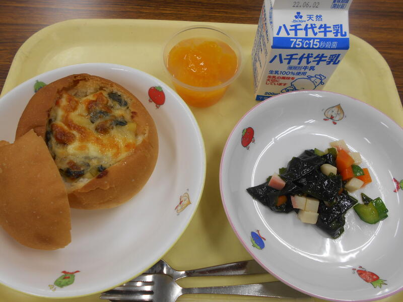 今日は、北方小学校だけのスペシャルメニューです。新メニューの「カップでグラタン」は、パンをくりぬいて中にグラタンを詰めて焼きました。中から食べても外から食べてもおいしいです。