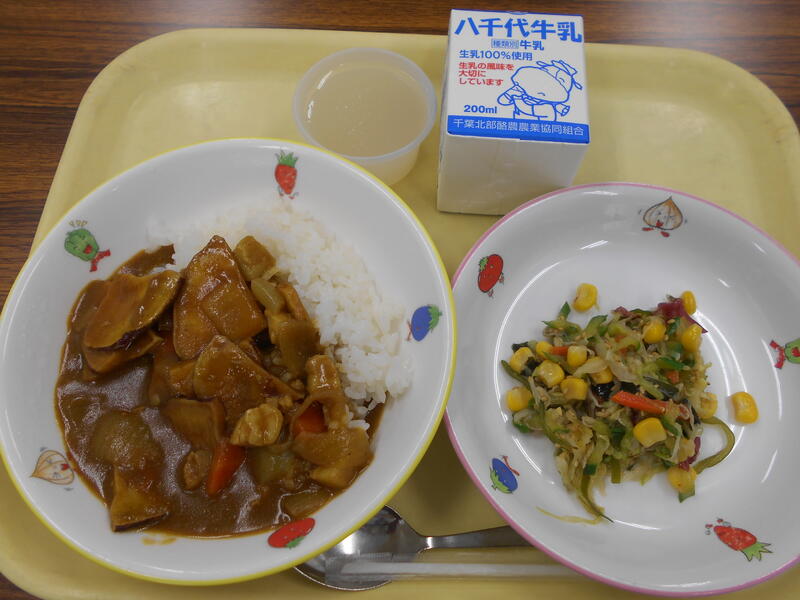 さつまいもと豚肉のカレー 海藻とじゃこのサラダ 市川のなしゼリー 牛乳