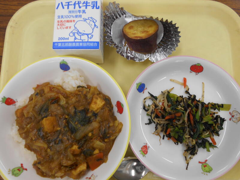 今日の給食は、カレー風味のから揚げとケーキの「クリスマスメニュー」です。ケーキは、イチゴ味とチョコ味のどちらかを自分で選んだものです。小麦粉・卵・乳製品が入っていないケーキなので、みんなが食べられます。ほかのメニューにもクリスマスの雰囲気が味わえる星が入っているので見つけてください。