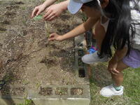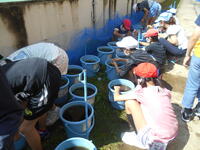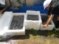 5年生 バケツ稲を育てています。発泡スチロール田んぼに稲を育てます。