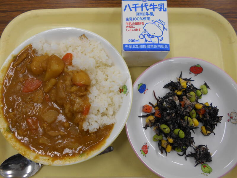 ポークカレー(ごはん) ささみとひじきのサラダ 牛乳