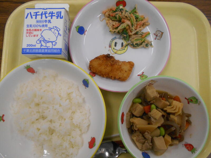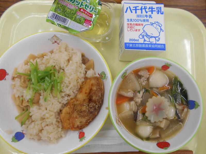 たけのこごはん 赤魚のから揚げ 白玉汁 マスカットゼリー 牛乳