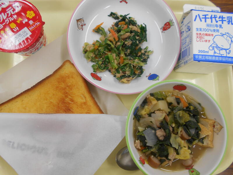 おかか和えは、やわらかい春キャベツをたっぷり使い、かつおぶしの風味がおいしいです。緑の彩りには、菜の花を入れました。給食は、いろいろな食材を取り入れるようにしています。今日は28品目の食材が入っています。