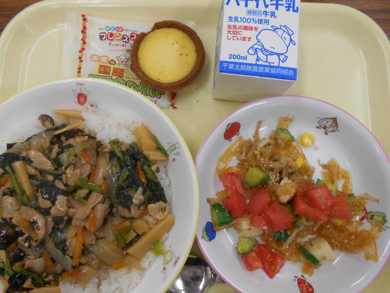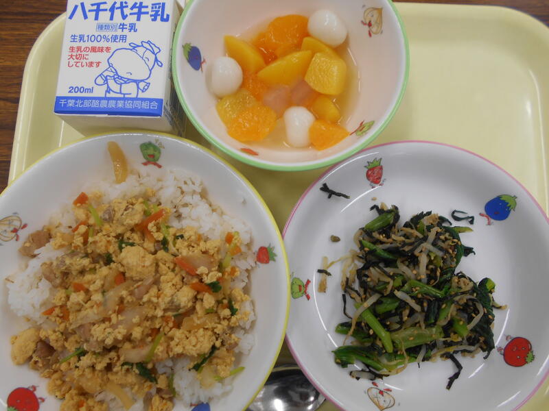 今日は親子丼です。親子とは、何と何でしょうか。答えは鶏肉と卵です。家で作られる親子丼は、とろとろの卵がおいしいのですが、給食では中心温度を90℃以上にしなければいけないので、普段食べるものよりしっかりとした食感になります。栄養満点のたっぷりの卵でとじた具をごはんにかけてください。