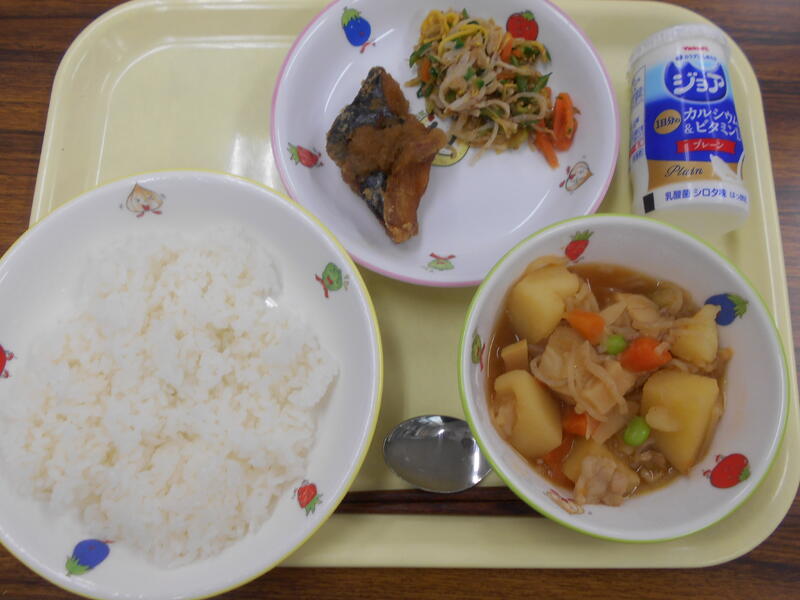 初めての給食は、人気メニューのカレーです。給食では、毎日様々な食材が出ます。苦手なものも少しずつ食べられるように頑張って、元気いっぱいに過ごしてほしいと思います。