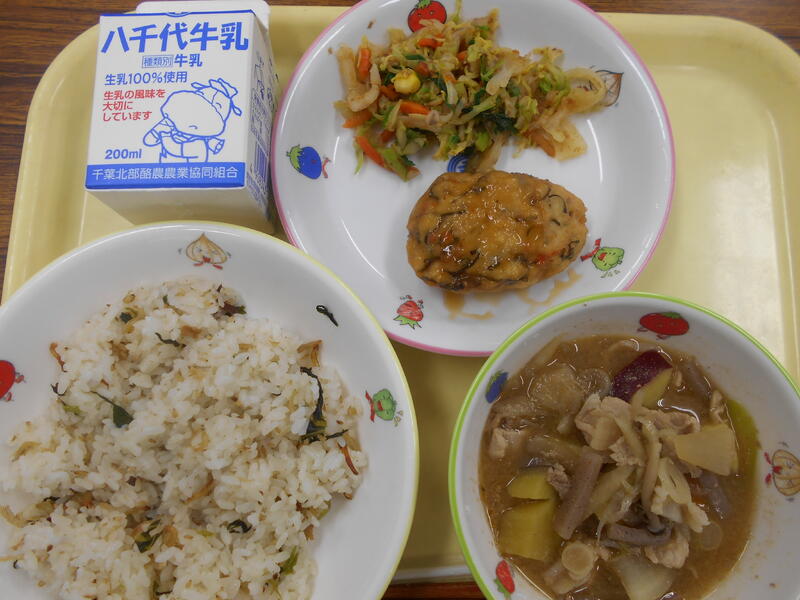 小松菜としらすのまぜご飯 飛龍頭あんかけ キャベツのおかか和え サツマイモ汁 牛乳