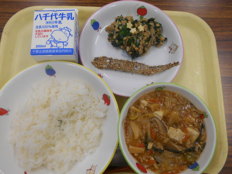 ごはん ししゃもの南部焼き チーズ入り納豆和え 四川豆腐 牛乳