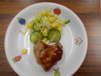 今日は、1年生を迎える会があったので、1年生のハンバーグは特別な形です。