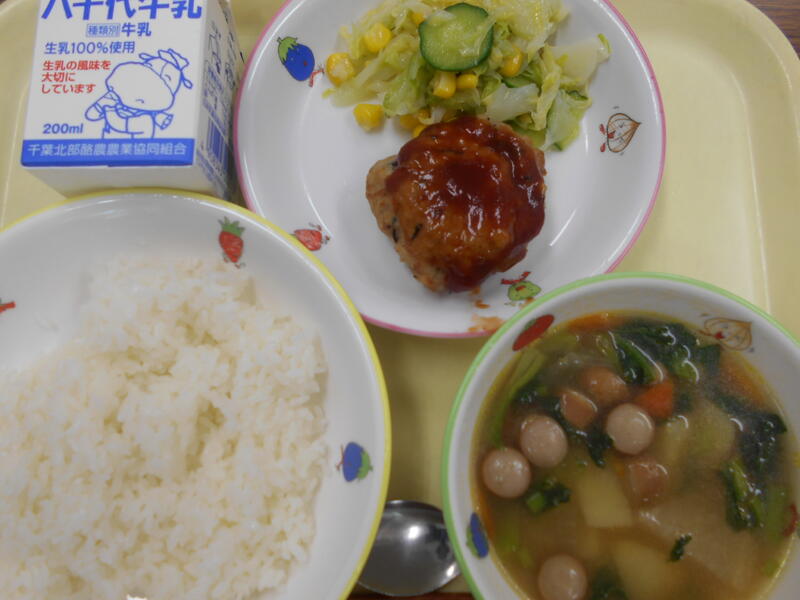 ごはん チーズインハンバーグ キャベツとコーンのサラダ ABCスープ 牛乳