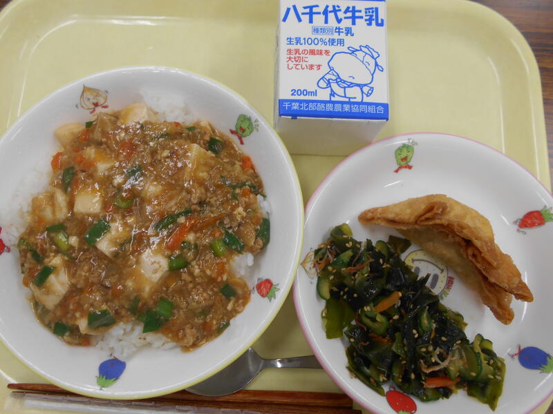 麻婆丼(麦ごはん) ツナ餃子 中華風酢の物 牛乳