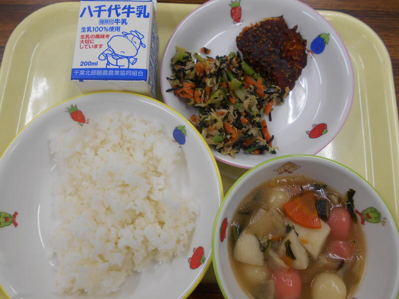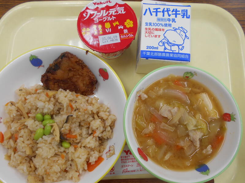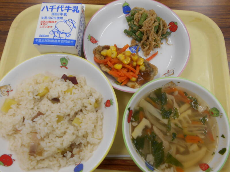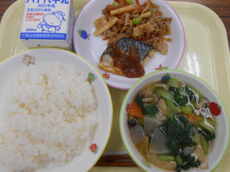 ごはん さばのみそだれ焼き たけのこきんぴら さつまいもと青菜ののっぺい汁 牛乳
