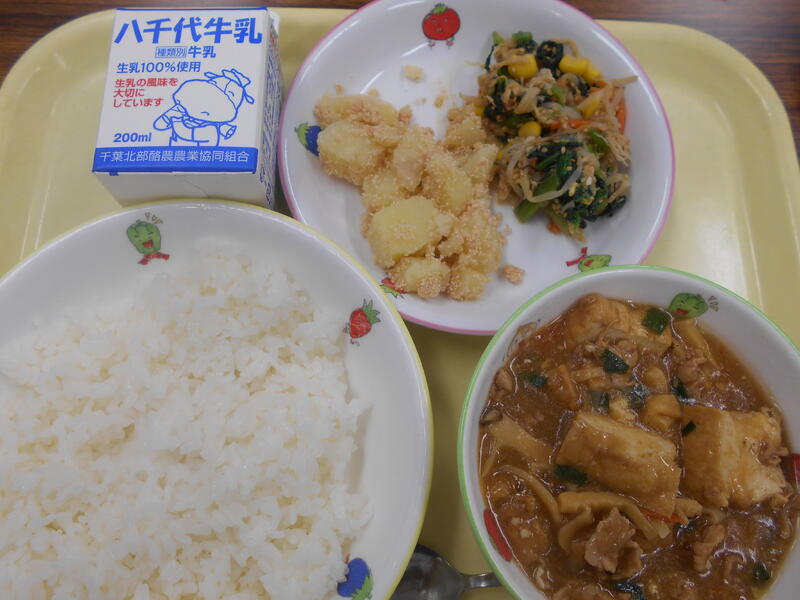 ごはん 家常豆腐 もやしとささみのナムル たらこポテト 牛乳