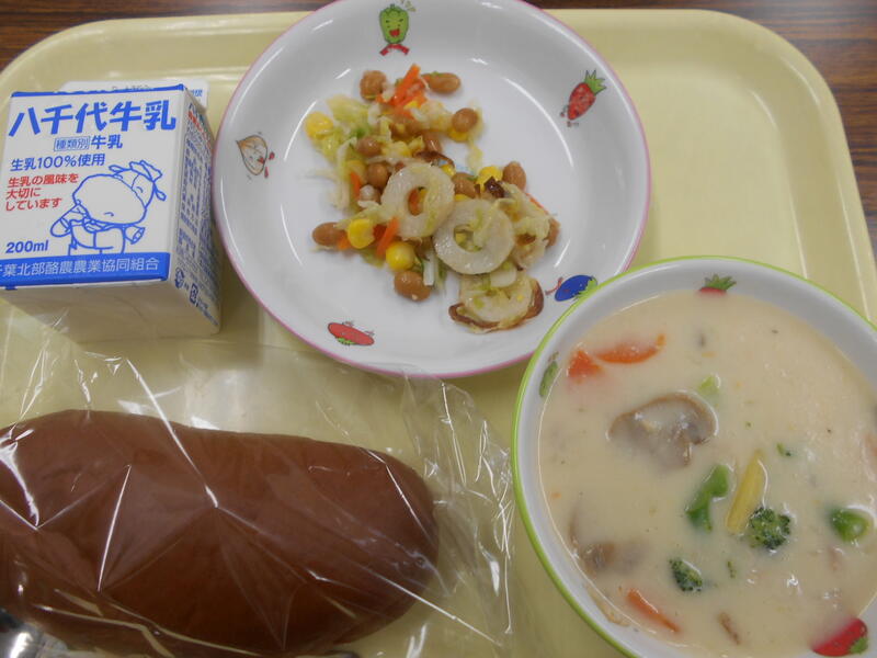 サラダは、「豆とちくわのサラダ」です。使っている豆は大豆です。大豆は集中力を高めて頭の働きをよくしてくれう「ブレイン・フード」のひとつです。体を作るもとになる「タンパク質」を強化するためにちくわも入っています。
