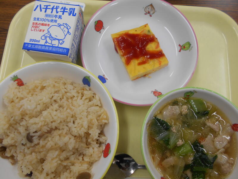 キノコピラフ スペイン風オムレツ 豚肉と野菜のスープ 牛乳