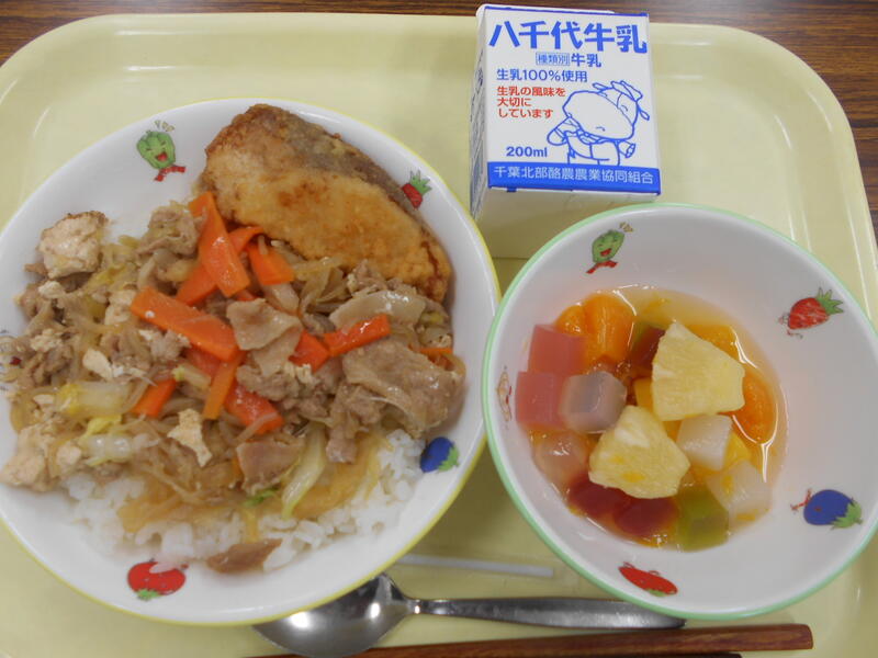 豚肉と焼き豆腐のすき焼き丼(ごはん) メルルーサのから揚げ フルーツゼリー和え 牛乳