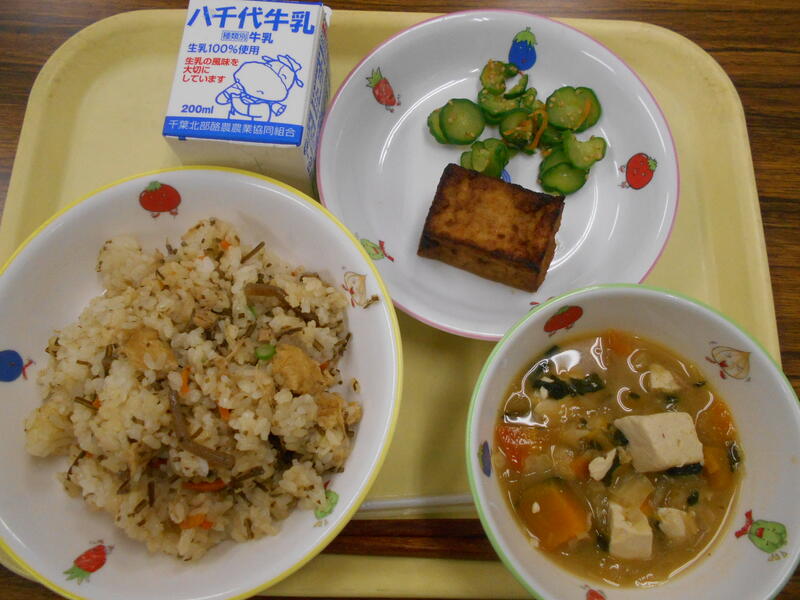給食では、夏野菜が多く入った丸い「かき揚げ」を五穀ごはんにのせて、しょうが入りの大根おろしソースをかけます。手作りのかき揚げは作るのはとても大変ですが、みなさんが今年残り半年も元気に過ごせるように一所懸命作りました。