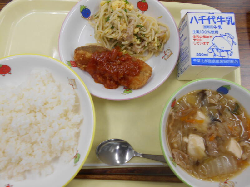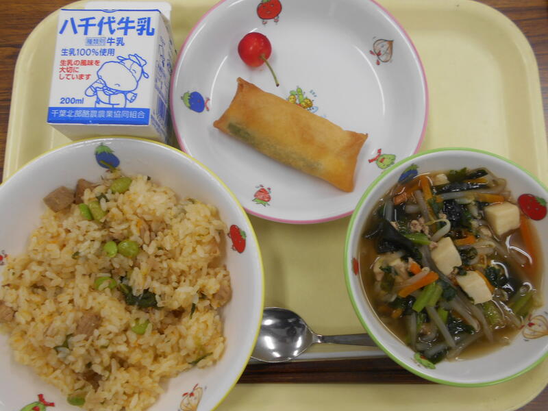 千葉にんじんチャーハン チーズとささみの春巻き ひき肉ともやしのスープ さくらんぼ 牛乳