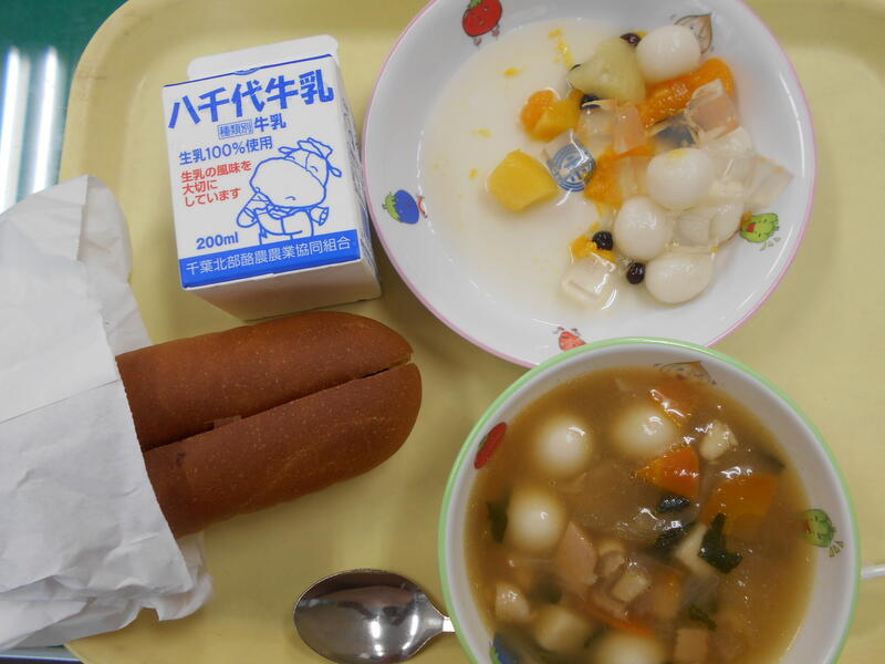 小松菜入りピザドッグ 冬瓜とうずら卵のスープ 白玉フルーツ寒天 牛乳