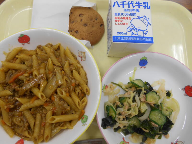カレーソースペンネ わかめとツナのサラダ がまくんのクッキー 牛乳
