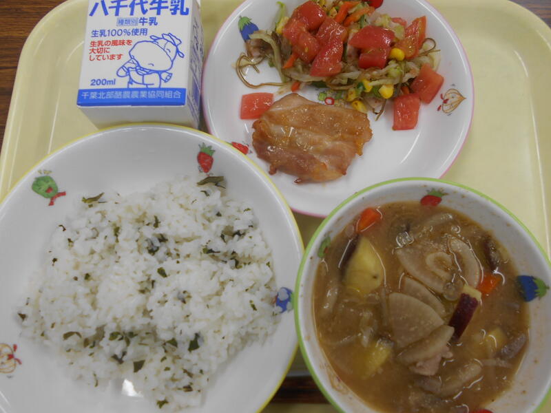 かみかみわかめごはん 鶏肉のマーマレード焼き りっちゃんの元気サラダ さつまいも汁 牛乳